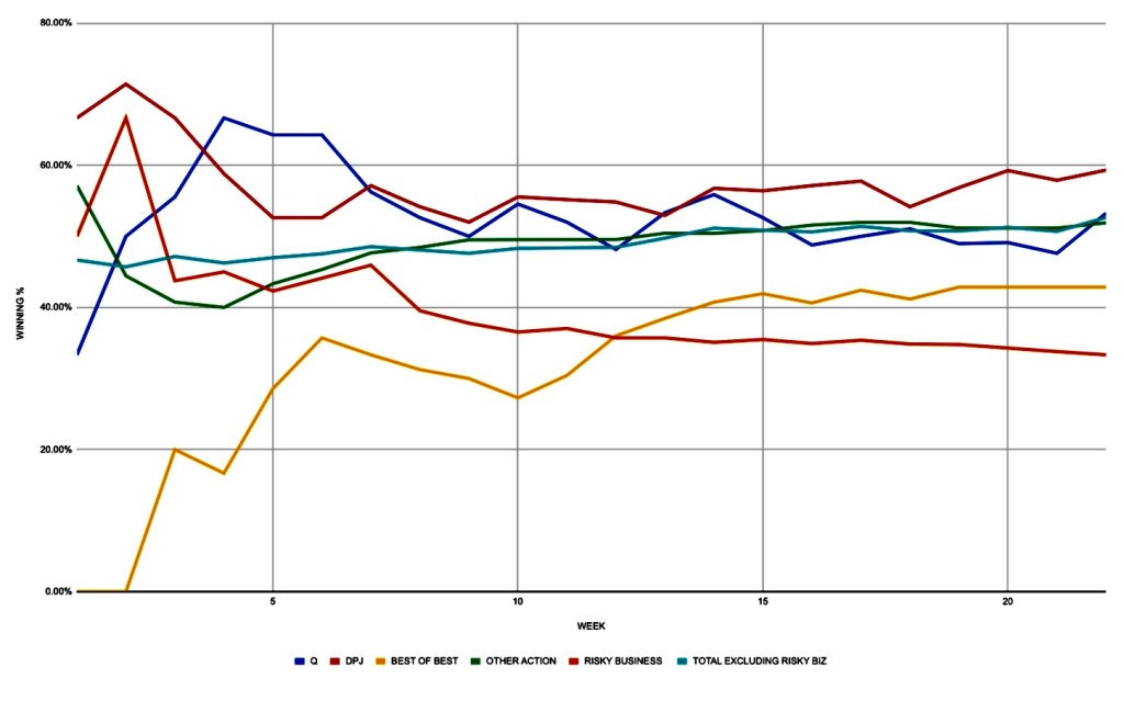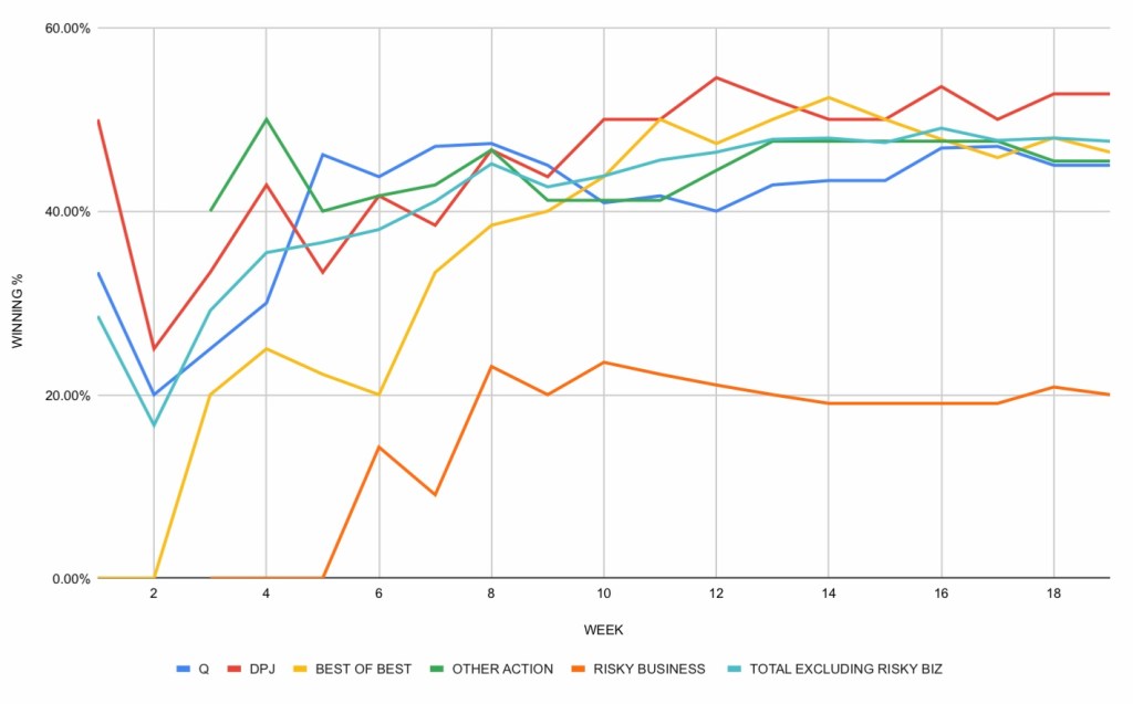 | TOTAL EXCLUDING RISKY BIZ | 60-66-1 | 47.62% | 41.30% | Week 16: 51-53-1 (49.04%) |